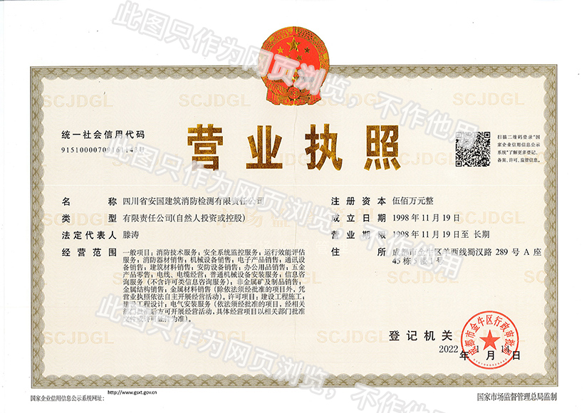 四川省安國建筑消防檢測有限責任公司,成立于1998年,經四川省公安消防總隊批準,工商部門注冊的獨立法人單位。 公司具有建筑消防設施檢測、電氣防火安全檢測、維修、保養及技術咨詢一級資質的中介技術服務機構,獲得CMA計量認證。主要業務范圍是:接受建設單位或有關單位委托,承擔新建、改建、擴建建筑自動消防設施技術檢測、電氣防火安全檢測、以及承接建筑消防設施維護保養,對已交付使用的建設消防設施的運行情況進行運行檢測,開展建筑消防設施的消防安全技術咨詢。公司設辦公室、總工辦、財務部、檢測部、維保部等職能機構,擁有一